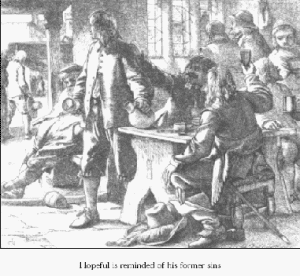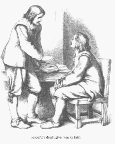 Concerning Hopeful’s Conversion Experience – Coming to Christ is properly the effect of faith: yet the language here used is warranted by Scripture. The word reveal, and the vision of Christ conversing with Hopeful, seem to sanction such things as have been greatly mistaken and abused, and have occasioned many scandals and objections: yet it is evident, that the author meant nothing contrary to the most sober statement of scriptural truth. Christ did not appear to Hopeful’s senses, but to his understanding: and the words spoken are no other than texts of Scripture taken in their